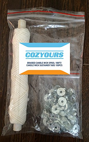CozYours BRAIDED WICK SPOOL 100FT WITH 100 CANDLE WICK SUSTAINER TABS, (candle wicks for candle making)