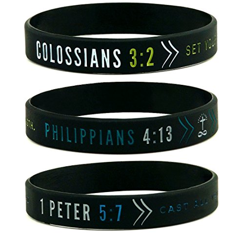 -. Binding : Misc. -. Brand : Inkstone -. Color : Black -. EAN : 0025093055584 -. Feature : Pack of 6 silicone wristbands with inspirational Bible verses / Standard adult size of 8" around; Classic unisex design is suitable for both him and her / COLOSSIANS 3:2 - Set your mind on things above, not on earthly things. / PHILIPPIANS 4:13 - I can do all things through Christ who gives me strength. / 1 PETER 5:7 - Cast all your anxiety on him because he cares for you. -. IsAutographed : 0 -. IsMemorabilia : 0 -. Label : Inkstone Gifts -. Manufacturer : Inkstone Gifts -. MPN : Gifts for Christian Teens Men Women 4B -. PartNumber : Gifts for Christian Teens Men Women 4B -. ProductGroup : Sports -. ProductTypeName : SPORTING_GOODS -. Publisher : Inkstone Gifts -. Studio : Inkstone Gifts -. Title : (6-pack) Faith Wristbands w/ Bible Verses - Religious Christian Apparel Bracelets Gifts - Adult Unisex Size for Teens Men Women -. UPC : 025093055584