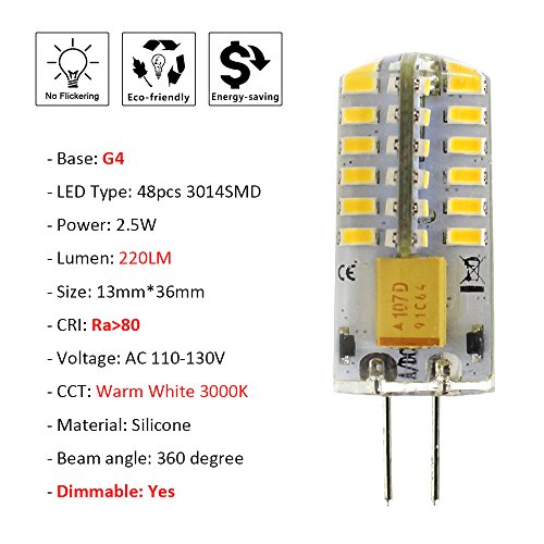 - 【Excellent Performance】 These G4 base DIMMABLE LED Bulbs designed to last for 30,000 hours or more, reducing the hassle of frequent replacement. Give off 220lm brightness. Instant on to full brightness, no flicker, no buzzing sound. They are able to go onto full brightness within 1 second.