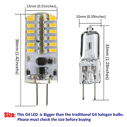 - 【Easy Installation】 Standard G4 Bi-pin base, silicone body, 48Pcs 3014 SMD, replace ordinary halogen bulbs, the bulb size:13mm*36mm(0.51inches*1.42inches). Please must check whether the size will fit your fixture (see the picture)