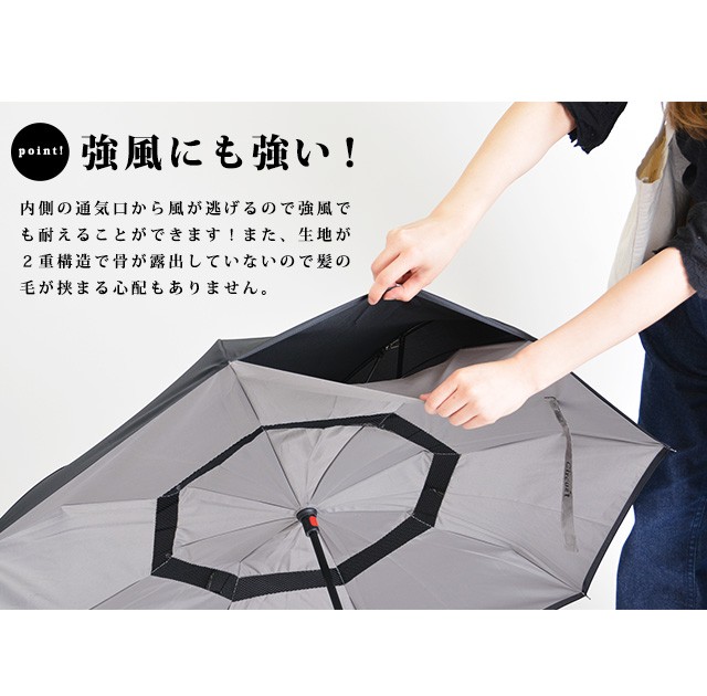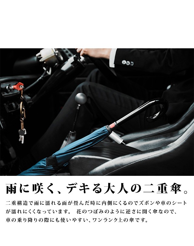 | 商品詳細 | Circus サーカス 雨に咲く、デキる大人の二重傘。 二重構造で雨に濡れる面が畳んだ時に内側にくるのでズボンや車のシートが濡れにくくなっています。 花のつぼみのように逆さに開く傘なので、車の乗り降りの際にも使いやすい、ワンランク上の傘です。 雨に濡れた面を内側に閉じる特殊な2重構造で水滴に触れずに使える人気の2重傘。 日本は1年の約1/3が雨の雨大国。雨の日の必需品である傘に感じている「あるある」な悩みを解決してくれます。 車の乗り降りで濡れてしまう、車内がビショビショになる「車での傘あるある」問題を解決。 花のつぼみのように逆さに開くので、車の乗り降り時にスムーズに傘の開閉が出来ます。 また濡れた傘でシートがビショビショになる問題も、濡れた面が内側にすることで解決してくれます。 他にも細かい嬉しいポイントが盛りだくさん。 電車で周りや自分が濡れないように気を遣うこともなく雨の日のストレスを軽減してくれます。 ベルトをしていない状態だと自立するのでチョイ置き出来て便利です。 2重構造のおかげでホネが露出していないので髪の毛が挟まる心配もありません。 特殊構造で2重だと重いのでは?という疑問をお持ちの方へ。 そんなことないんです!ペットボトル1本分と変わらない約500gなので女性でも手軽に使っていただけます。 【関連ワード】傘 長傘 雨傘 晴れ雨兼用 レディース メンズ ユニセックス プレゼント ギフト おしゃれ お洒落 オシャレ 丈夫 頑丈 ブランド 錆びにくい 軽量 軽い 安全 日傘 晴雨兼用 晴れ雨兼用 UVカット UV 雑貨 トラベル 旅行 持ち運び ミニ 無地 遮光 おすすめ ブランド 定番 ベーシック シンプル 人気 インスタ コーデ コーディネイト 兼用 二重傘 | ||