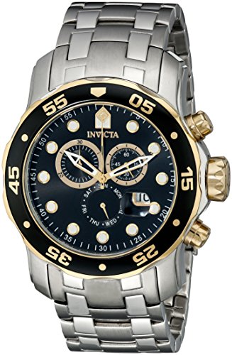 -. Binding : Watch -. Brand : Invicta -. Color : black -. Department : mens -. EAN : 0886678130542 -. Feature : Swiss quartz movement / Flame fusion crystal; stainless steel case and bracelet / Chronograph functions with 30 minute, 60 second and day of the week subdials; magnified date window at 4:00 / Black dial with gold tone and white hands and hour markers; unidirectional 18k gold ion-plated stainless steel bezel with black top ring; 18k gold ion-plated stainless steel crown and pushers / Water resistant to 660 feet (200 M): suitable for recreational scuba diving -. IsAdultProduct : 0 -. Label : Invicta -. Manufacturer : Invicta -. Model : 80039 -. MPN : 80039 -. PackageQuantity : 1 -. PartNumber : 80039 -. ProductGroup : Watch -. ProductTypeName : WATCH -. Publisher : Invicta -. ReleaseDate : 2013-12-17 -. Studio : Invicta -. Title : Invicta Mens Pro Diver Scuba Swiss Chronograph Black Dial Stainless Steel Bracelet Watch 80039 -. UPC : 886678130542