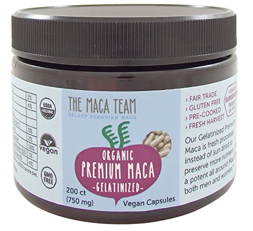 Our Gelatinized Premium Maca Capsules contain 100% Premium Maca root powder, traditionally grown and harvested on an organic farming co-op in a remote pristine part of the Peruvian Andes. Our Premium Gelatinized Maca powder is made using a unique process. Instead of being sundried after harvest, the fresh roots are immediately cleaned, ground into a pulp and low temperature dried to produce a powder which is then gelatinized to dissolve most starch content. This careful and quick handling preserves more vital nutrients of the Maca roots and makes for a significantly more potent product. Gelatinized Premium Maca is easier to digest than a Raw Maca powder making it suitable for the majority of people. It takes about 4 kg of Raw Maca roots to produce 1 Kg of Gelatinized Maca powder, making it more concentrated than Raw Maca. Our Premium Maca powder contains a combination of about 30% Red, 40% Yellow and 30% Black Maca roots. Given the special handling and combination of Maca colors, Premium Maca Powder is in our opinion the best all-purpose Maca for both Men and Women. Taking it in capsules offers several advantages. First, it is easier to get an exact serving size. Second, capsules are conveient to take with you on the go. And third, taking Maca in capsules is the easiet way to avoid the taste of the powder. The Maca Team, LLC is dedicated to preserving and sharing high quality Peruvian grown Maca with the world. As a family run company of Maca specialists, we're here to bring you the most Maca has to offer. We are proud to source and sell the best selection of high quality Peruvian Maca in the world. All of our products are always organically grown, fairly traded, GMO-free, fresh and potent. We sell 8 different kinds of certified organic Maca, raw and gelatinized (pre-cooked), in a variety of sizes, in vegan capsules and extracts. Please see our seller profile for more details and links to our products. Thank you for considering The Maca Team. Enjoy your day!Feature