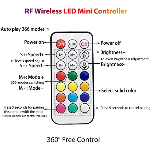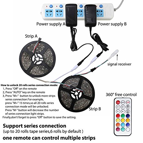 - Support Series Connection,360°Free Control: Up to 20 roll strips series connection(support 5 rolls series connection at default setting,check the third picture to see how to unlock 20 rolls tape series connection),RF signal range is up to 10 meters, you are free to control the led strips anytime you want.Auto mode provides more than 300 modes with different speed and brightness