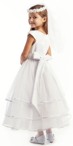 A Classy Feminine Special Occasion 3-Tier Organza Layered Dress for Communion, Weddings, Church, or any Special Event. The Gorgeous Pearl Beaded Waistband is on the front and a Large Attached Self-tie Sash on the Back. Available in White or Ivory in Sizes 2-20. This Ankle Length Dress is Fully Lined with a Zipper Back. 100% Polyester. Dry Clean or Hand Wash Only. Made in USA.Feature
