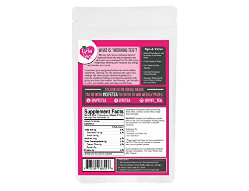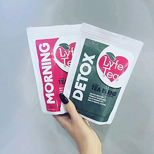 Lyfe Tea 14 Day Teatox is a Moringa complex blended with all natural ingredients that work with the body. Each order of Lyfe Tea contains 1 pouch of Morning Tea and 1 pouch of Detox Tea. Both tea pouches contain loose leaf tea. Morning Tea is blended with the highest quality of ingredients that work with the body to boost energy levels, control appetite, and aids in healthy digestion. The Detox Tea is blended with all natural ingredients that work with the body to rid itself of toxins. Detoxing the body can allow for built up toxins to be removed, making the body feel lighter, healthier, and less bloated.Feature