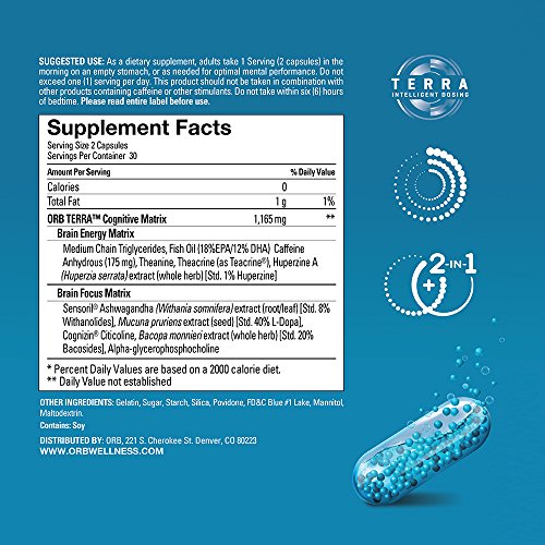 -. Feature : Brain complex and Fish Oil for cognitive synergy / FEEL caffeine and L-Theanine help support a calm but alert mental state / Supports memory performance, focus retention and sharper mental clarity / FORMULA HIGHLIGHTS: Huperzine A, Cognizin Citicoline, Caffeine, Sensoril / TIME RELEASE beadlets to support alertness and focus during the day