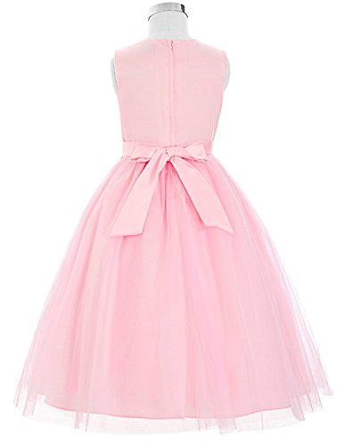 This Flower Girls Dress was made of stain and tulle. Lace Appliques and faux pearls decorate makes it lovely and elegant. The dress with crinoline netting inside,no petticoat is required to get same look as pictures show. Great choice for girls birthday party, bridesmaid wedding and other special occasions.