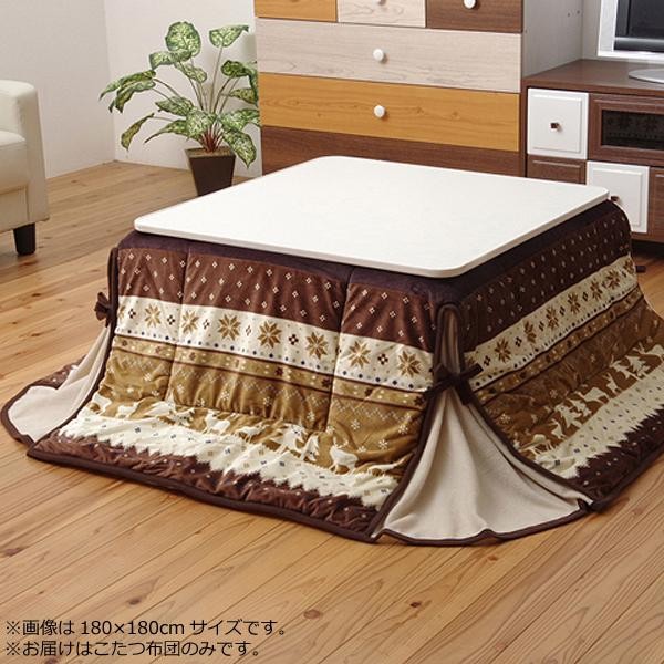 fk094igrjs冬らしいノルディック柄をあしらったこたつ布団です サイズ 約180×180cm 個装サイズ:50×57×28cm 重量 個装重量:2300g 素材・材質 表地:ポリエステル100%(短毛マイクロファイバー) 裏地:ポリエステル100%(フリース) 中綿:ポリエステル100% 仕様 洗濯機使用可(ネット使用) 75~80cm角のこたつ台に適応 生産国 中国 収納も簡単な省スペースタイプ 冬らしいノルディック柄をあしらったこたつ布団です