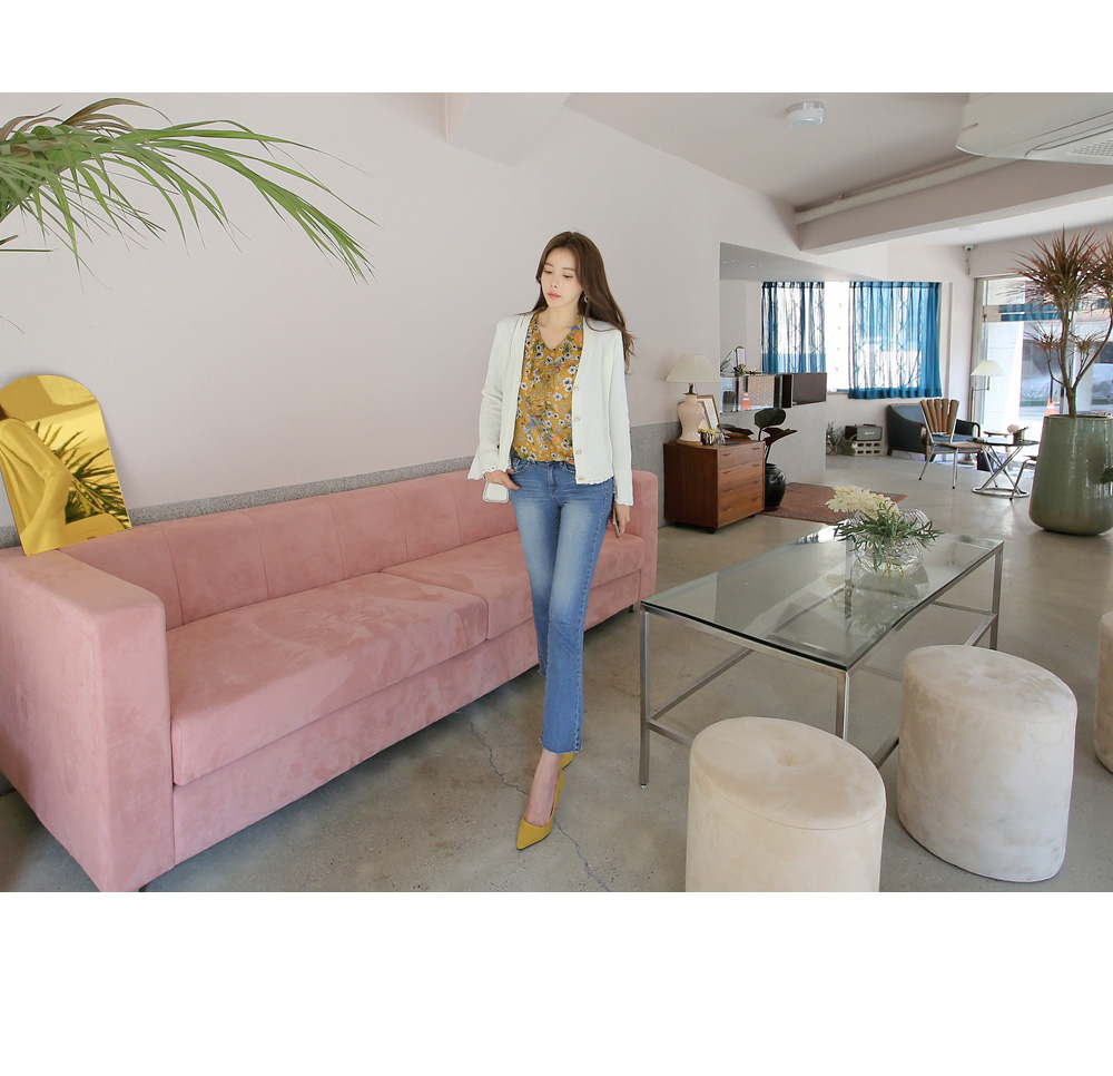 플라워 단추와 프릴 소매가 포인트로 들어가
