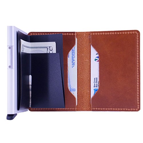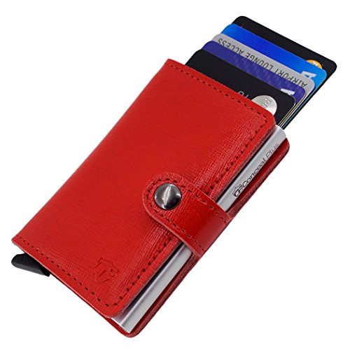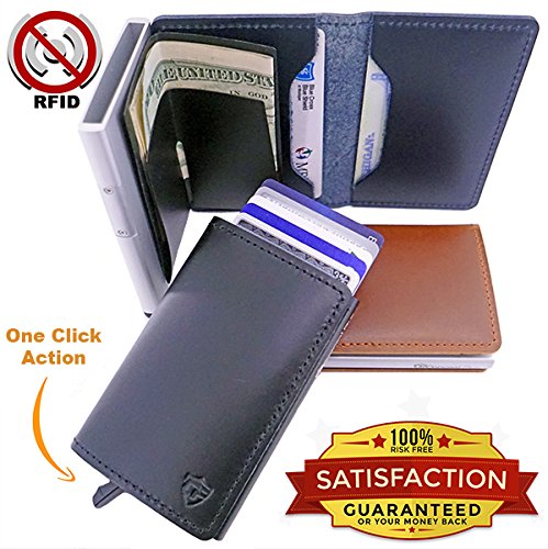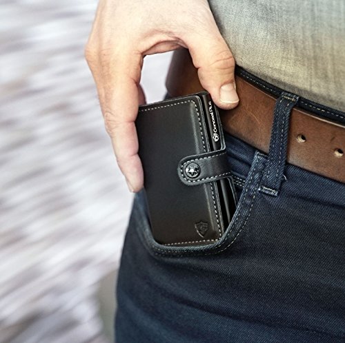 -. Feature : PERSONAL SECURITY - Best slim wallet protection for your credit cards and identity from RFID scanning thieves and electronics pick pockets. / RFID PROTECTION FOR TO 4-6 CARDS - This card case may be small but it holds 6 flat cards, or 4 embossed cards in the card protector, plus another 2-4 cards in the interior. / SOFT SUPPLE LEATHER COVER - Genuine 100% soft supple leather minimalist slim wallet design fits great in front or back pocket and won't bend. Button closure keeps contents in place. / ONE CLICK FUNCTIONALITY - With the one click action and credit cards slide out but are held securely in the sleeve. Best RDIF wallet womens or mens. / FOR WOMEN TOO - Keep your credit cards and ID organized and protected in your purse, clutch, or bag. No more digging through your wallet to find the card you were looking for. SATISFACTION GUARANTEED!!