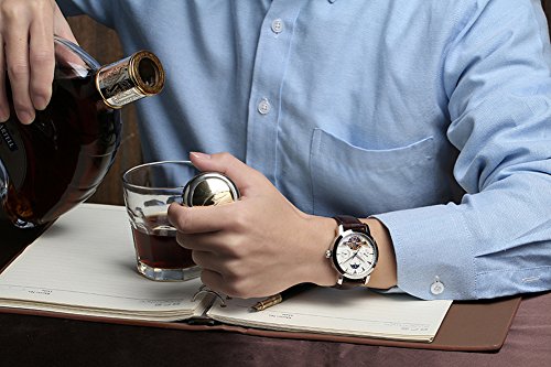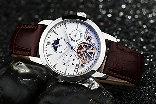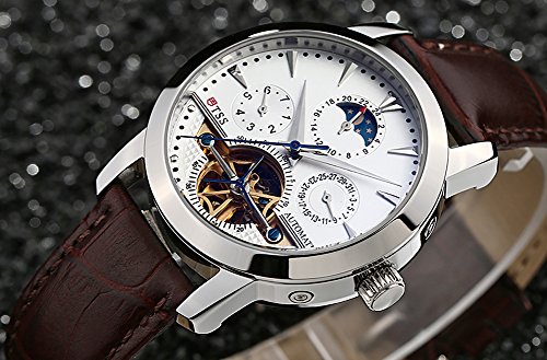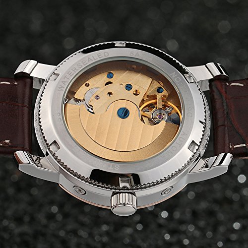 -. Feature : Round watch featuring white dial, silver blue hands, skeleton view, moonphase, exhibition caseback, day and date calendar type / 40.2mm stainless steel silver case with synthetic sapphire pure and clear window / Precise 21-jewel automatic movement with analog display / Brown leather band with buckle closure / Water resistant to 100 meters/330 feet/10 ATM: suitable for snorkeling, as well as swimming, but not diving