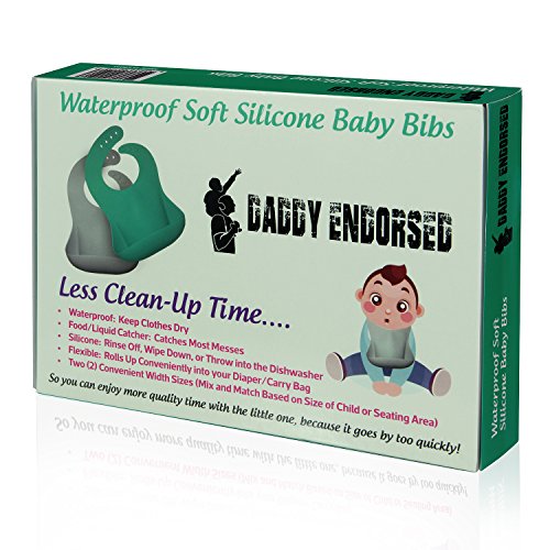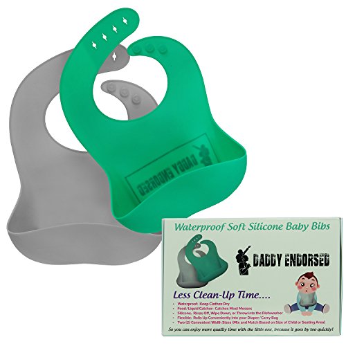 -. Title : Waterproof Silicone Baby Bib for Boy/Girl by Daddy Endorsed - These Soft, Easy to Clean, Durable Bibs Feature a Food Catcher Pocket In 2 Sizes That Make Cleanup and Life Easier - 2 Pack (Green/Gray)