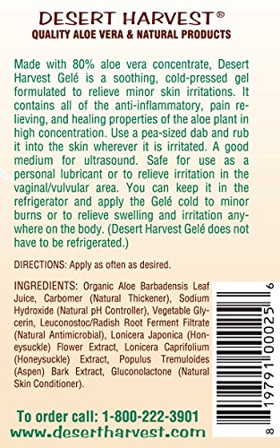 Studio : Desert Harvest Publisher : Desert Harvest Binding : Health and Beauty Product Description Made with 80% pure aloe vera concentrate, Desert Harvest Gele is a soothing, cold-processed gel formulated to relieve minor skin irritations. It contains all of the anti-inflammatory, pain relieving, and healing properties of the aloe plant in a high concentration. Desert Harvest Gele contains the most therapeutic levels of aloe vera possible in a 100% Natural topical application and contains No Parabens. 0