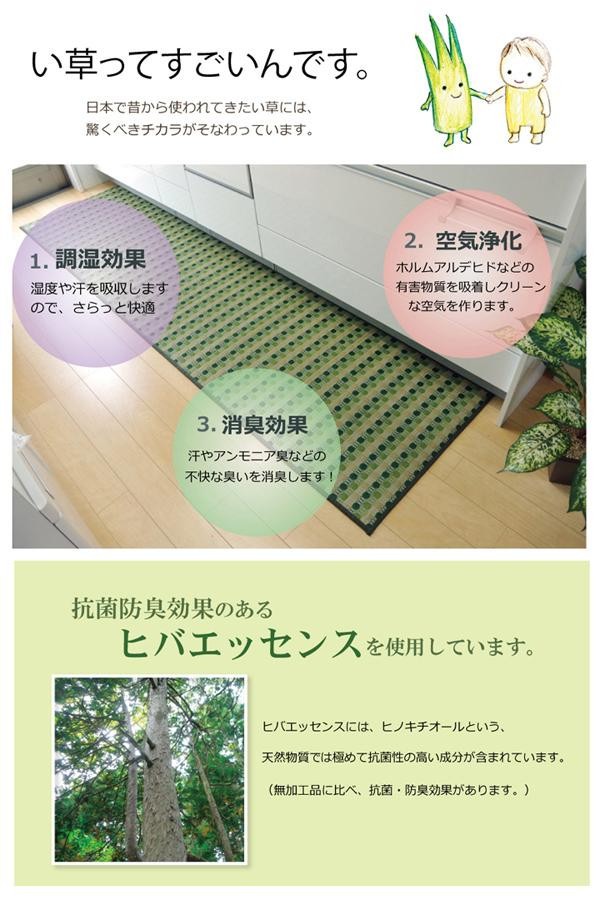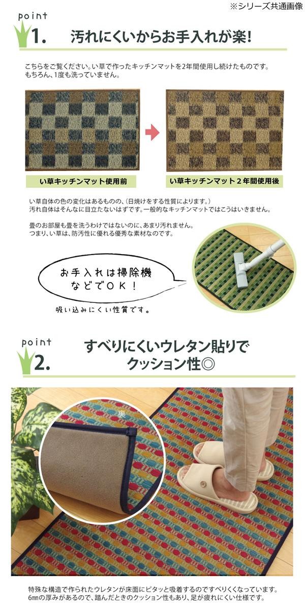 | 国産(九州産)のい草を使用したキッチンマットです。小さなゴミでも、ほうきで掃く・掃除機をかけるだけで取り除くことができます。裏にはウレタンを貼っていますのでフローリングでのご使用にも適しています。 |