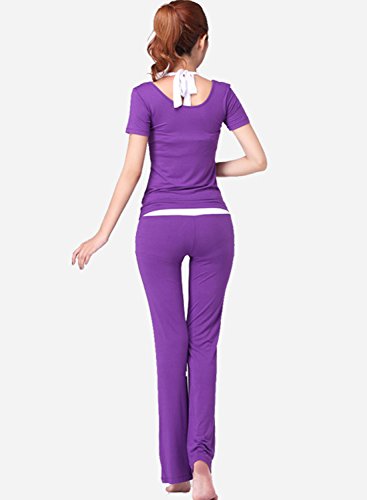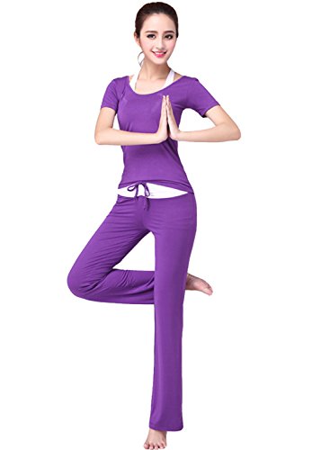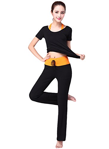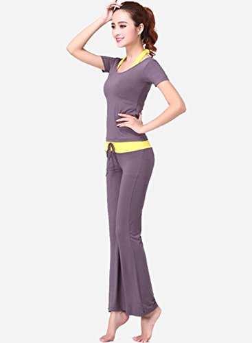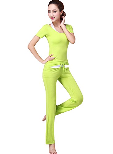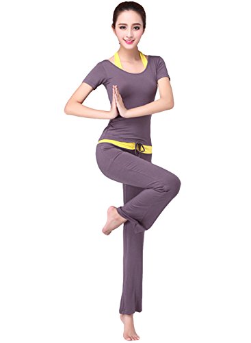 (아스 보그)ASVOGUE 레이디스 상품 무지 캐주얼 둥근 목 모양 반소매 브라 부착 톱스 롱 팬츠 스포츠 요가복 3PCS 세트