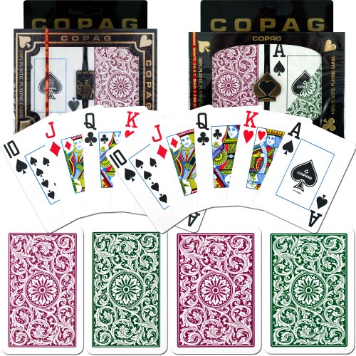 ReleaseDate : 2011-05-13 Studio : Copag Publisher : Copag Binding : Sports Product Description 100% plastic, these cards will last for years. Poker sized (2.5 x 3.5 inches) and Bridge sized (2.25 x 3.5 inches) with Burgundy and Green paisley design decks and jumbo-sized index. Includes durable and solid carrying case.COPAG plastic playing cards are made from a exclusively engineered PVC plastic. These cards can handle the wear and tear of normal games, outlasting paper cards up to 500 times. Completely washable, you don't need to worry soiled cards. A quick wipe with a damp washcloth, then dry and they are ready to go. Each set comes in its own hard plastic case for storage. Whether you play solitaire, have a kitchen table game or manage a card room - once you try COPAG you will never use any other cards again.Copag is compared to KEM cards at 60% of the cost. Try them, they will convince you there are no other reasonable options for quality 100% plastic cards.The history of COPAG is directly linked to the history of card games in Brazil. Pioneer in the manufacturing of decks, COPAG has been in this market since the beginning of the 20th century. Albino GonCalves, a graphics designer, founded the company in 1908 in the city of SAo Paulo and ever since COPAG has kept its position as the absolute leader in its market segment. Today, from its modern and large industrial facilities located in Manaus, in the state of Amazonas, COPAG sends part of its production to the international market, exporting decks to the United States as well as to different countries in Latin America. 0