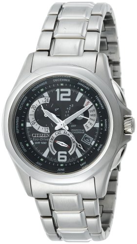-. Feature : Light powered eco-drive Japanese-quartz movement; charges in natural sunlight or indoor light / Durable, hardened mineral crystal / Stainless-steel case and bracelet / Perpetual calendar adjusts for odd/even months, and leap years through 2100; dual time function; daily alarm; day and date functions / Water resistant to 330 feet (100 M): suitable for snorkeling, as well as swimming, but not diving