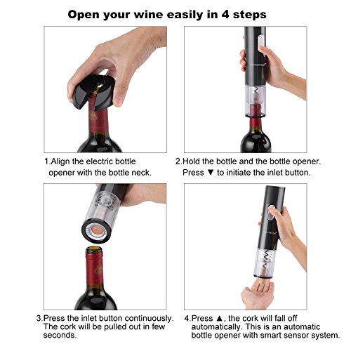 ☛VERY EFFICIENT TOOL electric wine opener make you eased in opening wine bottles. It is quiet when in use. It is great wine bottle opener.The opener smoothly pulls out the cork and releases it.