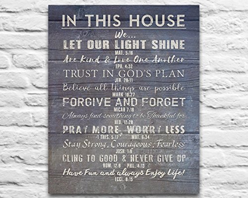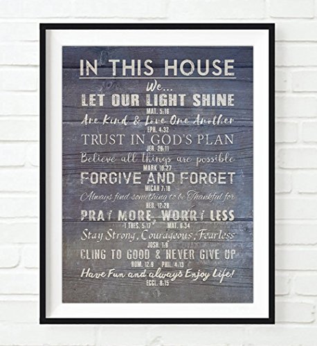 This 8x10 UNFRAMED PRINT is sure to bring hang with hope and make a great housewarming gift. This UNFRAMED print (NOT WOOD) displays several Bible verses: Matthew 5:16, Ephesians 4:32, Jeremiah 29:11, Mark 10:27, Michah 7:18, Hebrews 12:28, 1 Thessalonians 5:17, Matthew 6:34, Joshua 1:9, Romans 12:9, Philippians 4:13, and Ecclesiastes 8:15.