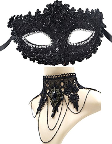 Black Venetian Mask Masquerade Mask with Elegant Vintage Princess Lace Gothic Necklace Pack of 2