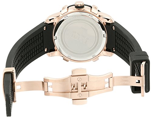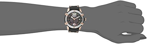 Black mother of pearl dial with rose gold tone and white hands and Arabic numerals, black and rose gold tone hour markers; luminous; stainless steel bezel encrusted with 18 white diamonds (approx. 0.14 TCW) with black silicone rim and rose gold tone ion-plated stainless steel accents; rose gold tone ion-plated stainless steel crown with black silicone rim; sapphitek crystal; rose gold tone ion-plated stainless steel case; black silicone strap