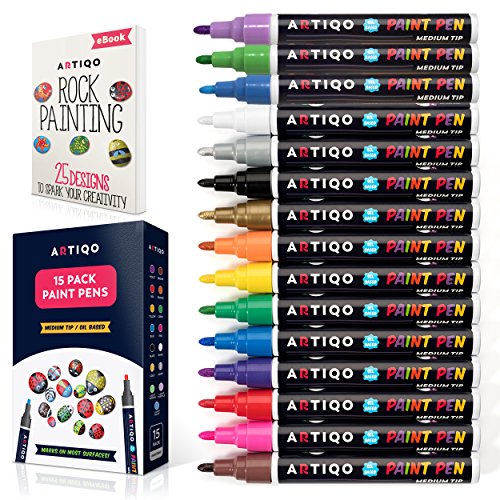 Paint Pens for Rock Painting - Wood, Glass, Metal and Ceramic Works On Almost All Surfaces Set of 15 Vibrant Medium Tip Oil Paint Pens, Quick Dry, Water Resistant