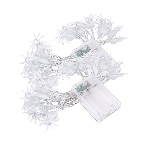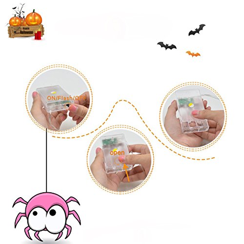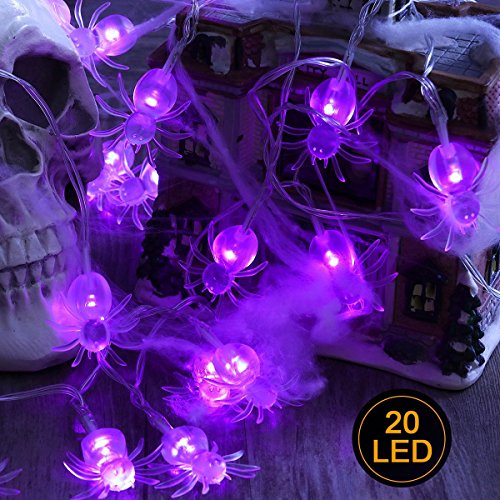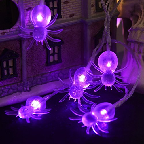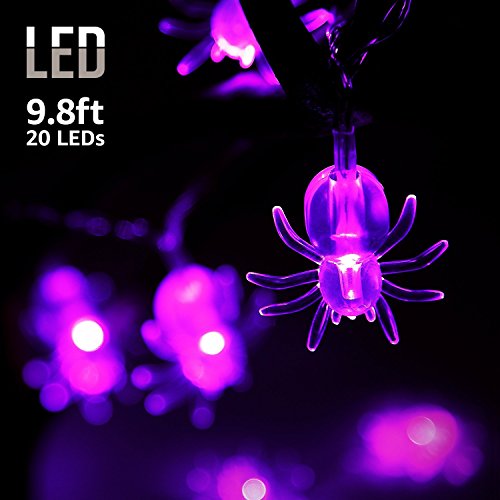 -. Feature : Light Modes : Two modes switched to be chosen: Steady On / Flash. / Warm light and beautiful appearance: Purple and spider appearance makes the lighting effect more fascinating, glamorous and scary.That can create "Halloween festival atmosphere" anywhere. / Halloween Decoration: These spider Halloween lights is perfect for Halloween Party, and other festival parties, shows, cosplay parties, Masquerades, school, home, club light decorations. / Battery Operated: Powered by 3 * AA battery (Not provided). Low power consumption, safe and reliable. No worries about extension cord and plug will limit you. / Easy To Use: Since the lights do not require a plug, they can be used anywhere and for any purpose. For indoor and covered outdoor use.