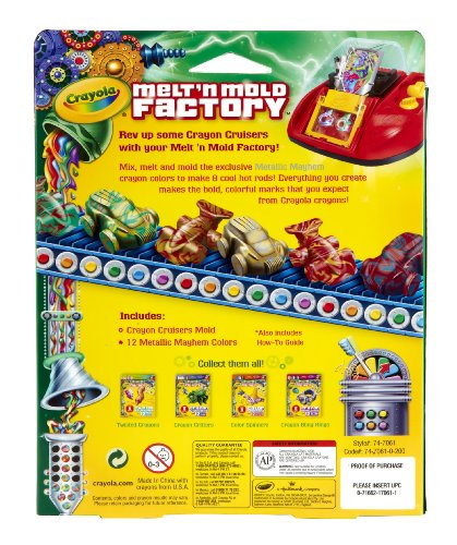 -. Binding : Toy -. Brand : Crayola -. EAN : 0885769332261 -. Feature : Mix, melt and mold the exclusive Metallic Mayhem Crayon Colors to make 8 Cool Hot Rods / Create customized multi color crayon / Everything you create makes the bold colorful marks that you would expect from Crayola Crayons / Melt and mold colorful wax to create your own creation / Refill packs extend creative play -. IsAdultProduct : 0 -. ItemPartNumber : 74-7061 -. Label : Binney & Smith -. LegalDisclaimer : not for 0-3 childern -. Manufacturer : Binney & Smith -. Model : 74-7061 -. MPN : 74-7061 -. PackageQuantity : 1 -. PartNumber : 74-7061 -. ProductGroup : Toy -. ProductTypeName : TOYS_AND_GAMES -. PublicationDate : 0100 -. Publisher : Binney & Smith -. Studio : Binney & Smith -. Title : Crayola Melt 'N Mold Crayon Cruiser Expansion Pack -. UPC : 071662170615 -. Warranty : No Warranty