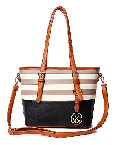 -. Brand : Hue & Ash -. Color : Black Tan and White -. Department : womens -. EAN : 0753610327448 -. Feature : Dimensions: 14.0 inches wide x 10.0 inches height x 5.0 inches depth / Two Interior compartments separated by a zippered pocket. / Material is faux leather / Also contains a detachable adjustable up to 25 inch shoulder strap drop / Exterior zippered pocket -. Model : HNA2052-GREY -. ProductGroup : Shoes -. ProductTypeName : HANDBAG -. Size : Medium -. Title : Hue and Ash Black with Tan and White Stripes Top Handle Satchel Handbag -. UPC : 753610327448