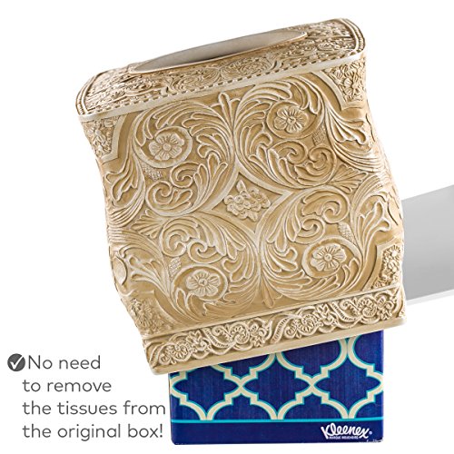 DECORATIVE TISSUE BOX HOLDER – Cover Fits Most Standard Square Kleenex & Other Tissue Boxes; Features Sleek Ornate Italian Scroll Pattern & Swirling Floral Motif