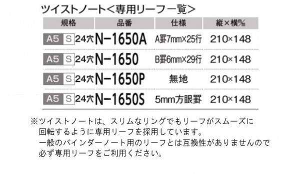 | 仕様 | 規格:A5・S型(タテ型)・24穴 リーフ枚数:30枚(B罫6mm×29行) 最大収容枚数:40枚 |