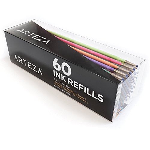 -. Feature : Arteza Gel Pens Ink Refills - 60 Color Bundle / Ink colors include - 4 Classic, 12 Glitter, 12 Metallic, 8 Pastel, 12 Neon, 12 Fluorescent / Writes vivid, medium lines with a 0.8 - 1.0 mm metal tips / Acid-Free & Non-Toxic
