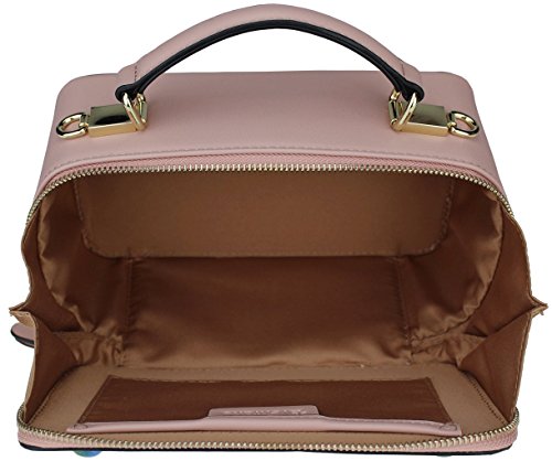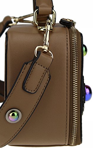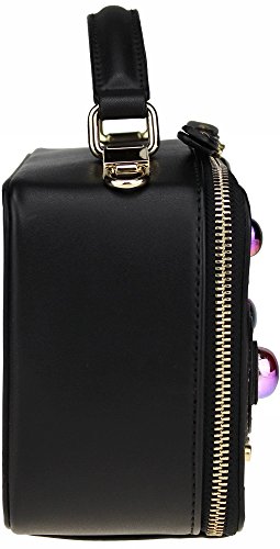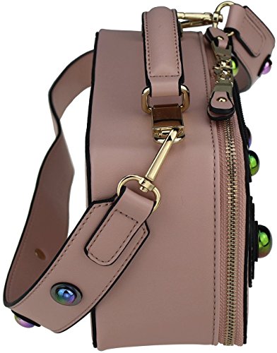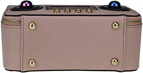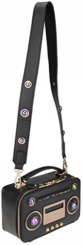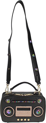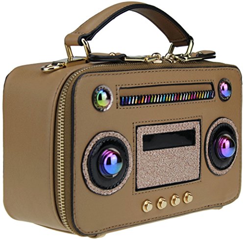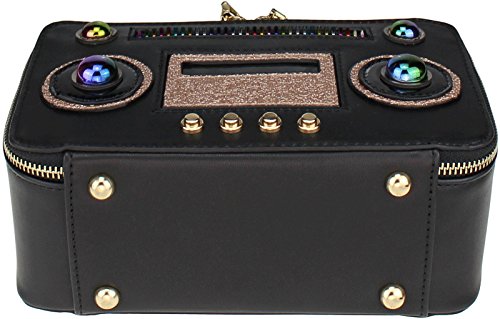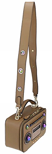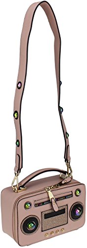 Product Description Fashion bag with metallic hardware and with pink metallic trim, metallic studs and colorful zipper trim. The strap is adorned with over-sized metallic studs and is also used to create the look of the radio in the front facade of the purse. Has gold tone hardware and zipper closures at the top. Contains one interior pocket. NOT a real, functioning radio. Just a radio aesthetically. 0
