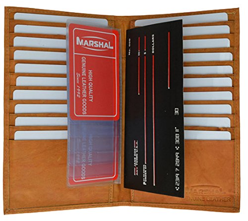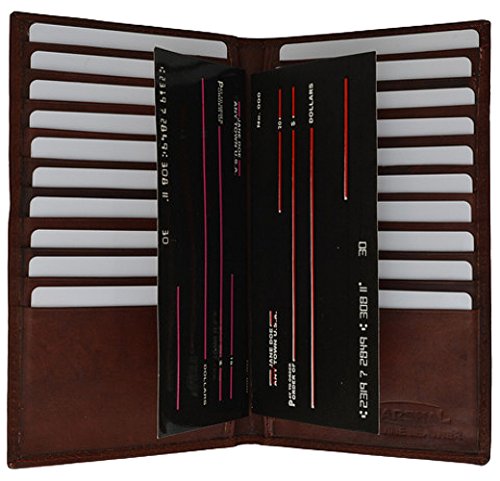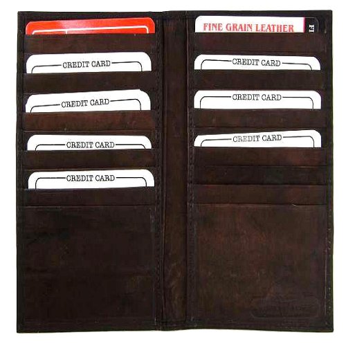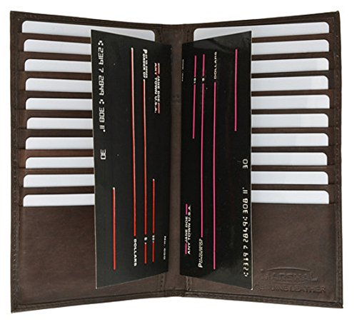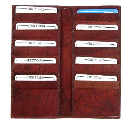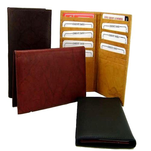 Product Description Material: Genuine Leather Bi-fold Size: 8.5' x 8' Credit Card Slots: 20 Currency Pocket: Slots under each side for cash. Do you carry around many credit cards and your check book? Well this wallet is for you! 0