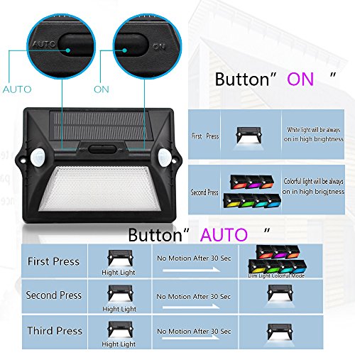 - 5 LIGHITNG MODES FOR CHOOSING: 2 buttons "Auto" &“On"for motion sensing and always on, easy to set. Colorful Light Sensor Mode (Strongly recommended) Mode2: Dim White Light Sensor Mode Mode3: Bright White Light Sensor Mode Mode4: Dim White Light Non-Sensor Mode Mode5: Colorful Light Non-Sensor Mode