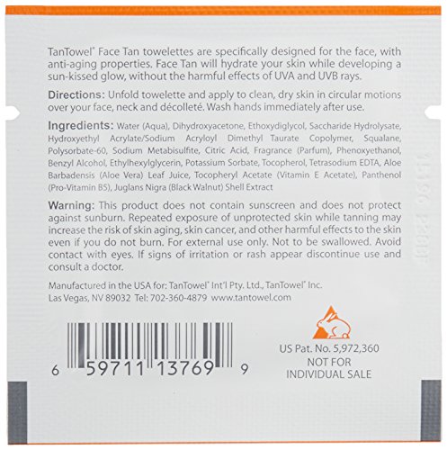Face tan patented towelettes are infused with a clear self-tan liquid, and anti-aging properties designed specifically for the face. This advanced formula will hydrate your skin while developing a sun-kissed glow, without the harmful effects of uva and uvb ray exposure.Feature