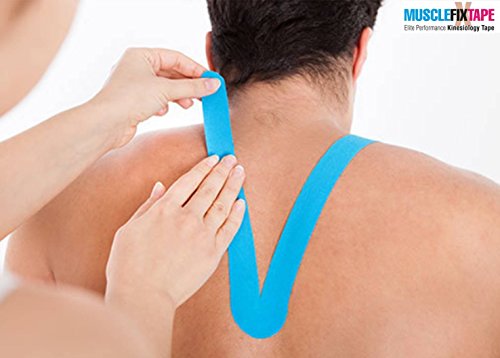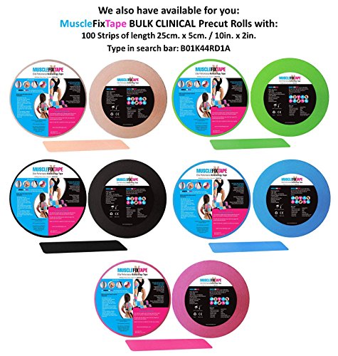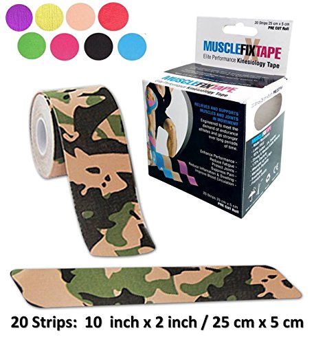 - • 20 STRIPS 25cm x 5cm / 10in x 2in OF PREMIUM QUALITY & ENHANCING PERFORMANCE KINESIOLOGY RECOVERY PRE CUT TAPE: Muscle Fix Sports Tape lifts your skin away from muscles increasing the blood circulation, providing fast and effective pain suppression and relief, joint protection, fatigue reduction and support for muscles, ligaments and tendons aches and injuries. Ideal for shoulder, neck, elbow, lower back, knee, ankle and many others. FDA, CE and ISO Certified.