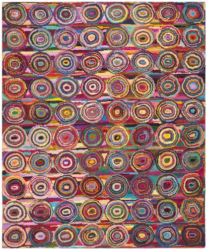 The textural mastery of New England's fiber artists is on full display in the brilliant colors and impeccable construction of the Nantucket Rug Collection. Exquisite rainbows, woven into an abstract pattern with circles creates a marvelous work of art. This rug is made using soft cotton in a thick, tufted/hooked pile for a luxurious feel underfoot and a shower of color to enliven home decor.