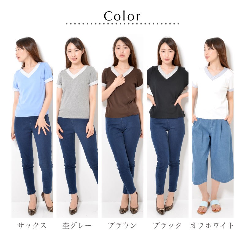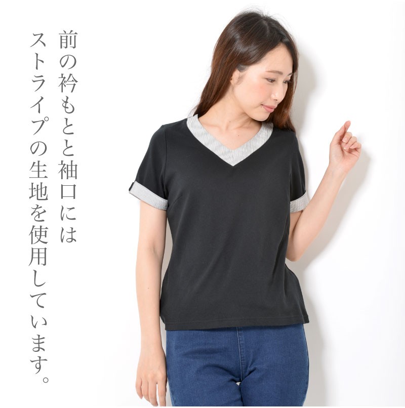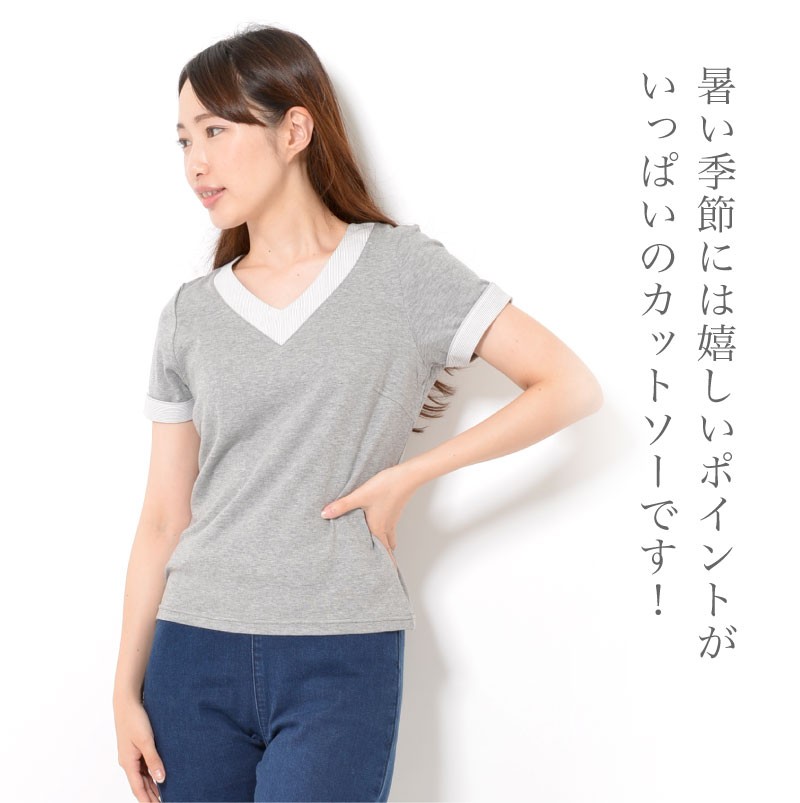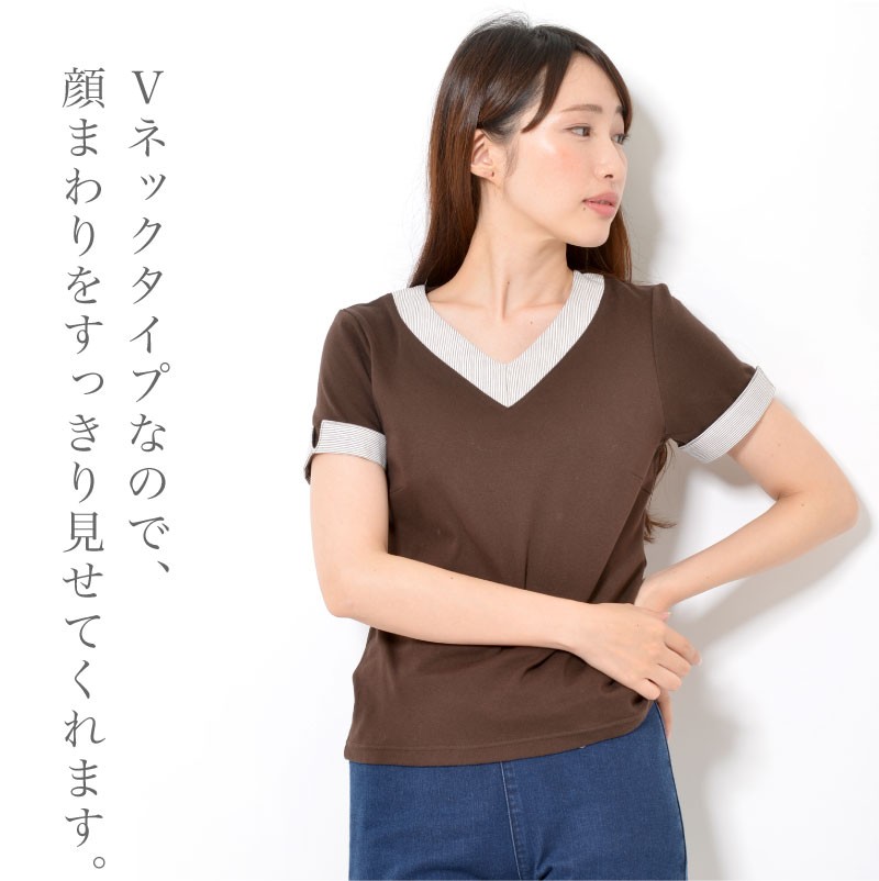 Vネックタイプなので、顔まわりをすっきり見せてくれます。