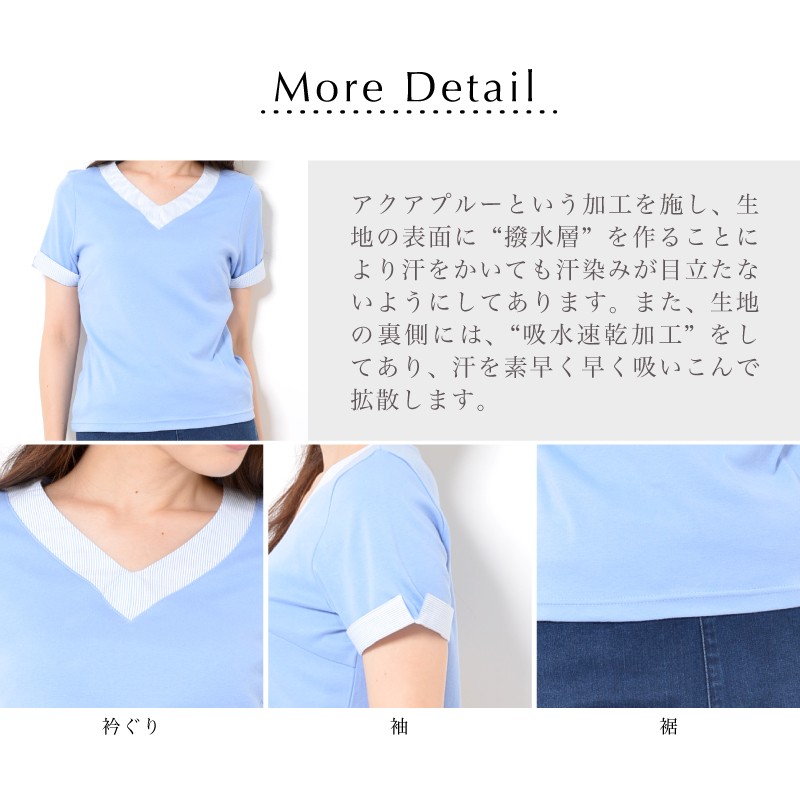 アクアプルーという加工を施し、生地の表面に"撥水層”を作ることにより汗をかいても汗染みが目立たないようにしてあります。