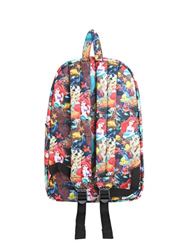Loungefly x Disney canvas backpack with an allover print from The Little Mermaid featuring Ariel & Flounder hangin' out in a colorful coral reef. Padded back and adjustable straps. Interior features grey and white stripe lining with a laptop sleeve. Front zip pouch pocket, zip closure. Note: Print location may vary!
