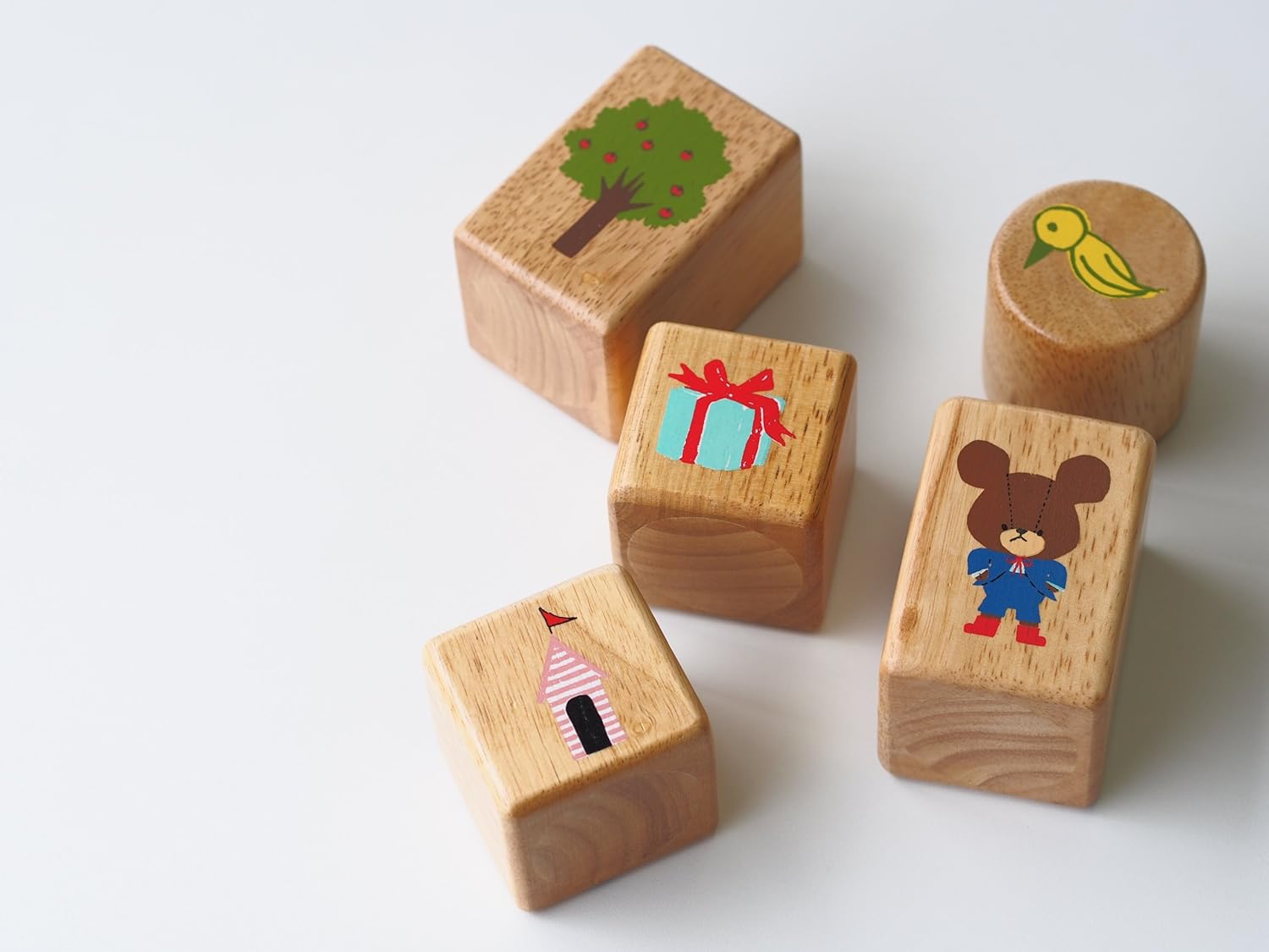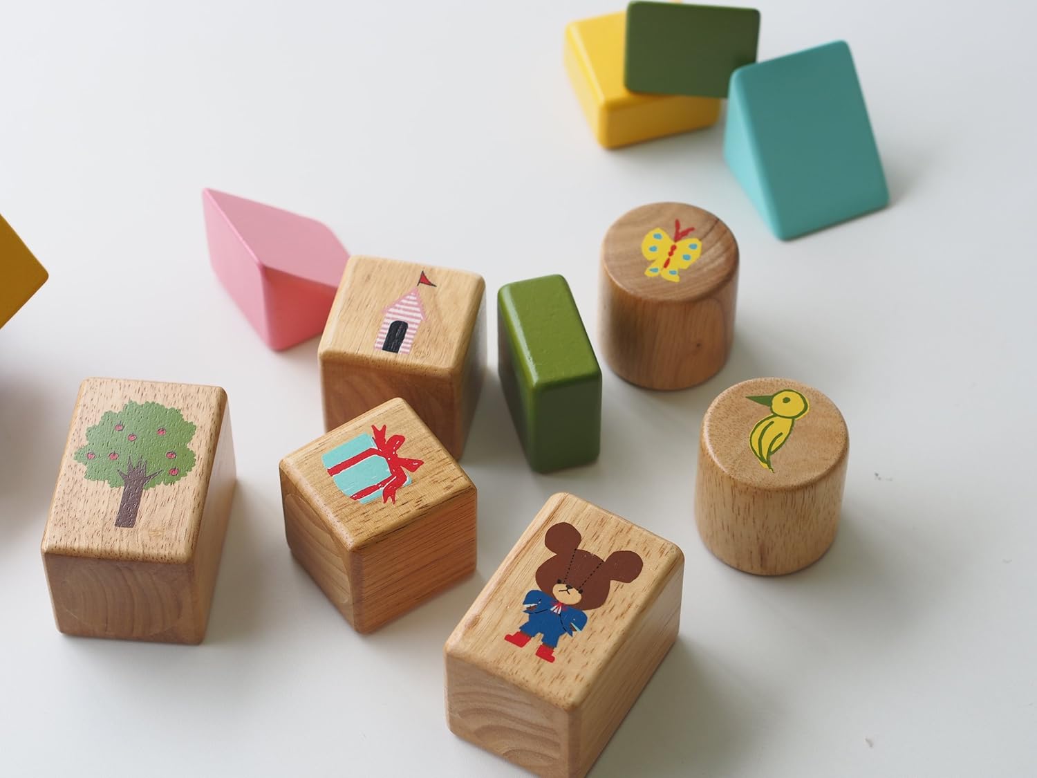 初めてつみき遊びをする小さなお子様でも使いやすい基本辺5cmサイズ。角の無い丸いデザインで安心して遊べます。絵が付いているつみきは形によって振ると違う音がします!商品内容:音積木×6、カラーブロック8個 計14個