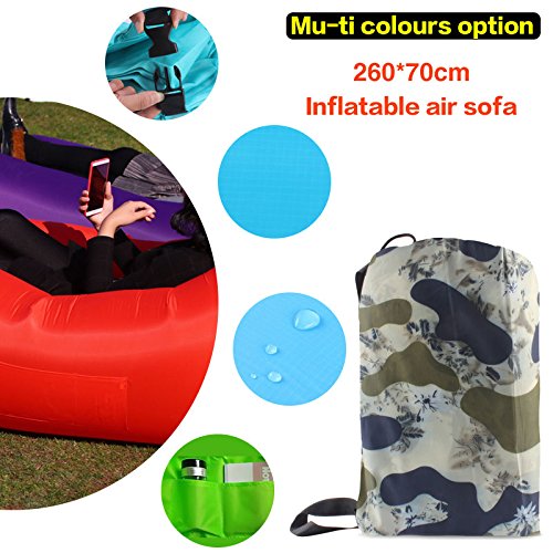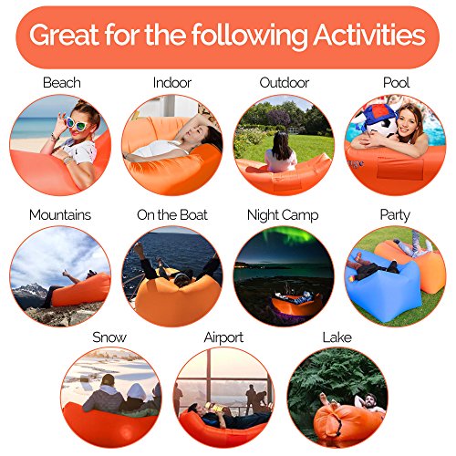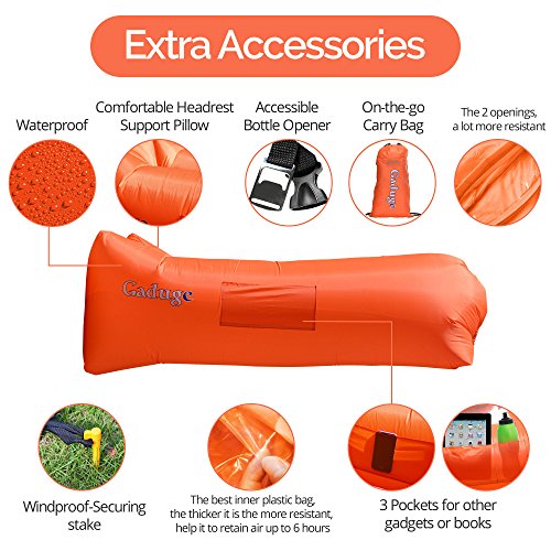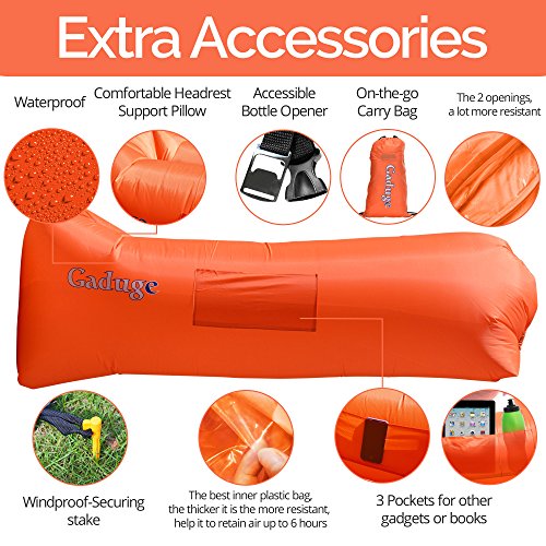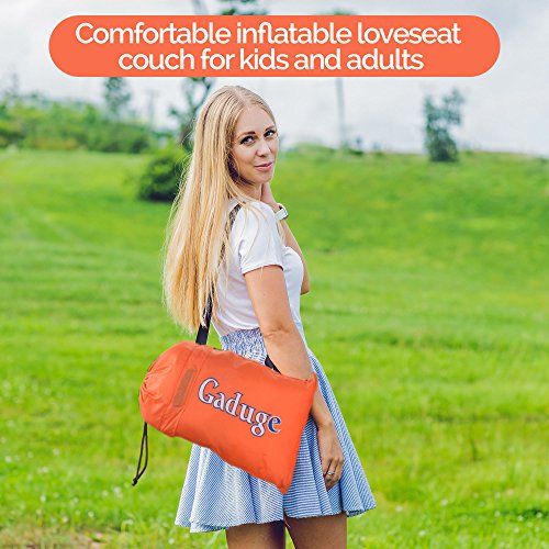 Get the air sofa that combines all the best features in one package. It is everything you wanted: ?? A pool lounger raft for lazy days on the water ?? The inflatable lounge couch that stays inflated long after the show ends ?? A heavy duty inflatable lounger that holds up to 300lbs on all sorts of terrain ?? With pockets for your personal items and an opener for your drinks The Gaduge Hangout Couch is designed for maximum comfort, relaxation, and durability. COMFORT ?? The headrest cradles your head and neck when you are lying down ?? A dual tube design provides better support for your body and retains air for longer ?? Large inflatable lounger expands to 6.89 feet long by 2.3 feet wide, for you and a friend RELAXATION ?? Simple to inflate in seconds, no air pump needed, and no blowing it up with your mouth ?? Lightweight at only 3 pounds, portable and compact for transport ?? Easier to manage than a bulky, heavy folding chair ?? Use it indoors or outside, wherever you want to chill out DURABILITY ?? Smooth ripstop nylon shell resists wet weather and abrasion, and it dries fast ?? Tough double 12 polyethylene liner that retains air and keeps out water This is the hangout lounger worth buying. Unpack it, scoop air into it, then roll up the open end and clip it. Enjoy! We stand behind it with a 100% money-back satisfaction guarantee. 0 |