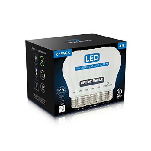 Great Eagle 100W Equivalent LED Light Bulb 1590 Lumens A19 Warm White 2700K Dimmable 14-Watt UL Listed (6-pack)