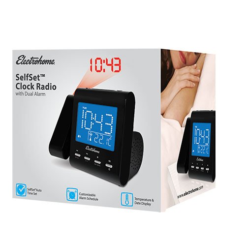 - Title : Electrohome Projection Alarm Clock with AM/FM Radio, Battery Backup, Auto Time Set, Dual Alarm, Sleep Timer, Indoor Temperature/Day/Date Display with Dimming & Audio Input for Smartphones (EAAC601)