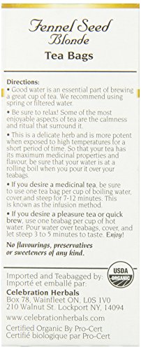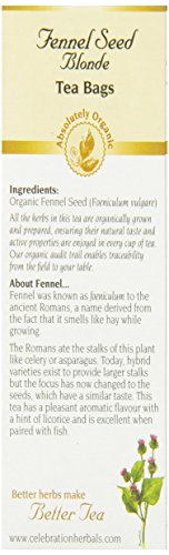 -. Binding : Grocery -. Brand : Celebration Herbals -. EAN : 0628240201447 -. Feature : Fennel was known as foeniculum to the ancient Romans, a name derived from the fact that it smells like hay when growing / Celebration Herbals -. Label : Celebration Herbals -. LegalDisclaimer : This statement has not been evaluated by the Food and Drug Administration. This product is not intended to diagnose, treat, cure, or prevent any disease. -. Manufacturer : Celebration Herbals -. MPN : CEL201447 -. NumberOfItems : 1 -. PackageQuantity : 1 -. PartNumber : CEL201447 -. ProductGroup : Health and Beauty -. ProductTypeName : GROCERY -. Publisher : Celebration Herbals -. Size : 24 -. Studio : Celebration Herbals -. Title : Celebration Herbals Organic Fennel Seed Blonde Tea Caffeine Free -- 24 Herbal Tea Bags -. UPC : 628240201447