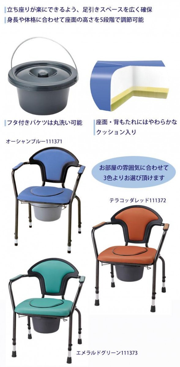 広い足引きスペースで立ち座りが楽にできます。身長や体格に合わせて座面の高さが5段階に調節できます。座面と背もたれのやわらかなクッションはやさしい座り心地。バケツは付け外しが簡単にでき、丸ごと水洗いも可能です。お手入れしやすい素材とシンプルな構造。おしゃれな3色からお選びいただけます。 |