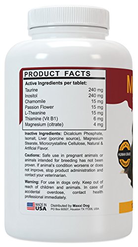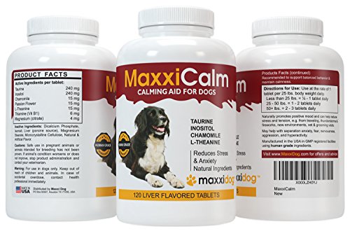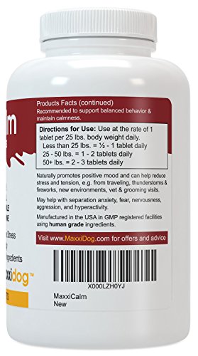 -. Feature : MaxxiCalm has calming effect on nerves that helps to keep your dog calm and relaxed. It helps dogs to cope with external stresses / MaxxiCalm helps maintain contentment during separation, travel, motion sickness, and tension caused by changes in your dog's daily routine. It may be used for behavioral problem management and for dogs exhibiting nervousness, hyperactivity, discontentment, or responding to environmentally-induced stress. May help curb destructive behavior / It is all about the ingredients. MaxxiCalm is formulated for results. MaxxiCalm contains only safe natural ingredients that promote a sense of relaxation and mental alertness WITHOUT drowsiness / MaxxiCalm comes with Dog Behavior Guide (eBook) to help you to work WITH your dog and get better permanent results / We don't compromise on quality. MaxxiCalm is made in the USA in GMP and NASC (National Animal Supplement Council) certified manufacturing facility using only human grade ingredients, tested for purity and potency