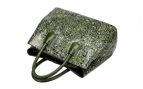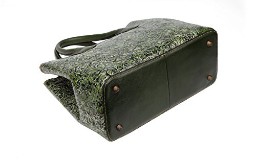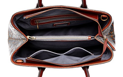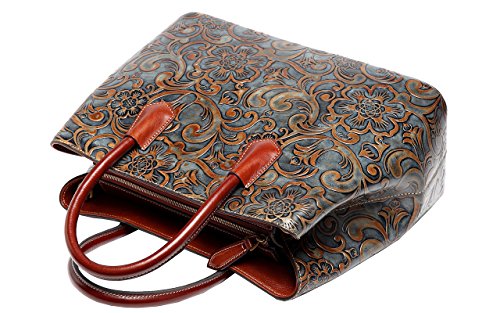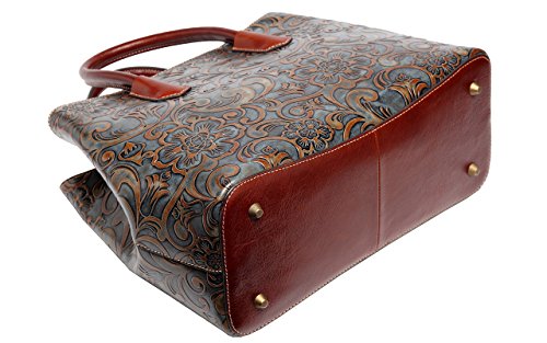 -. Feature : Material: high end genuine distress leather(top grain cowhide) embossed with fashion floral pattern / Quality hand stitched, durable fabric lining, high quality brass hardware, zippered closure / Capacity inside Structure: 1 central zippered pocket, 1 wall zippered pocket and 2 pouches inside / Size approx.:14"L 6"W x 11"H, 4.75"Double handles and 45"-51" long shoulder strap to cross over the body / This Designer branded ladies purse can be flexible used in 2 ways, Tote and Cross Body satchel bag.